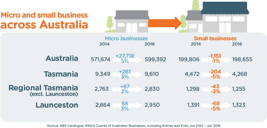 Regions and suburbs playing a part in this growth include Campbell Town, Perth-Evandale and rural Westbury. The increase in micro-businesses in these areas between 2014 and 2016 has been between 20 and 25%, respectively.