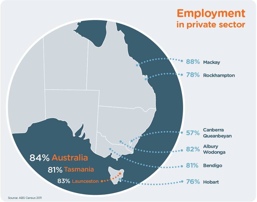 The proportion of the workforce supported by the private sector in Launceston is several percentage points higher than in most Australian cities of a similar size. As stated by Bernard Salt, “About one-in-five Tasmanians live in Launceston and every one of them, I suspect, is conscious of the need to ‘make a go of it’”.