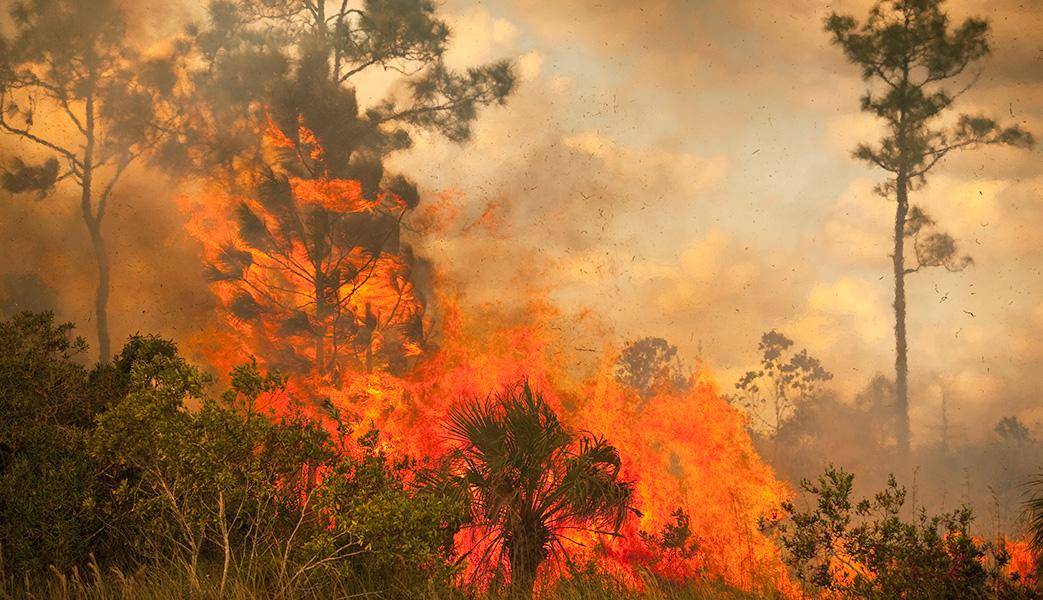 A sweeping flood, rampaging fire, or a raging cyclone can devastate huge areas.
