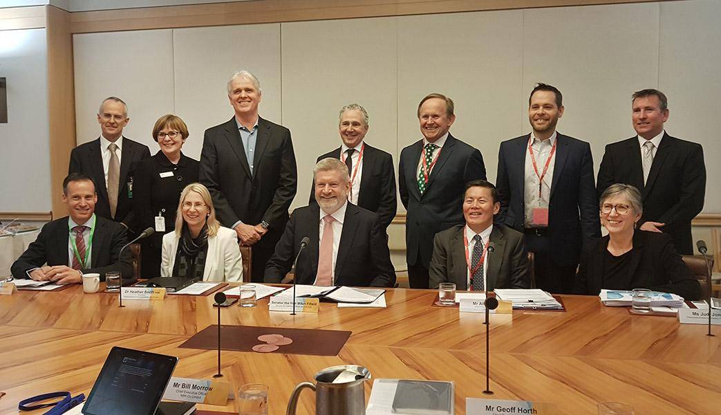 Back row: (L-R): Rod Sims (Chairman, ACCC); Nerida O'Loughlin (Chair, ACMA); Bill Morrow (CEO, nbn); Andy Penn (CEO, Telstra); Geoff Horth (Group CEO, Vocus); Craig Levy (COO, TPG); John Stanton (CEO, Communications Alliance)