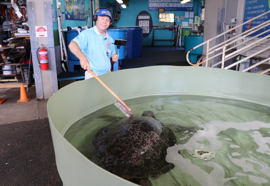 "Now this is typically what they’ll do for themselves. Out in the wild, it’s not unusual to find turtles under ledges, and they’ll keep their carapace – or shell – fairly clean of any fouling marine life. They’ll actually visit what we refer to as ‘cleaning stations’, where different fish species may use their shell as a big dinner plate and graze off any algae or other marine life that has settled upon it. I don’t think she would get tired of me doing this today.”
