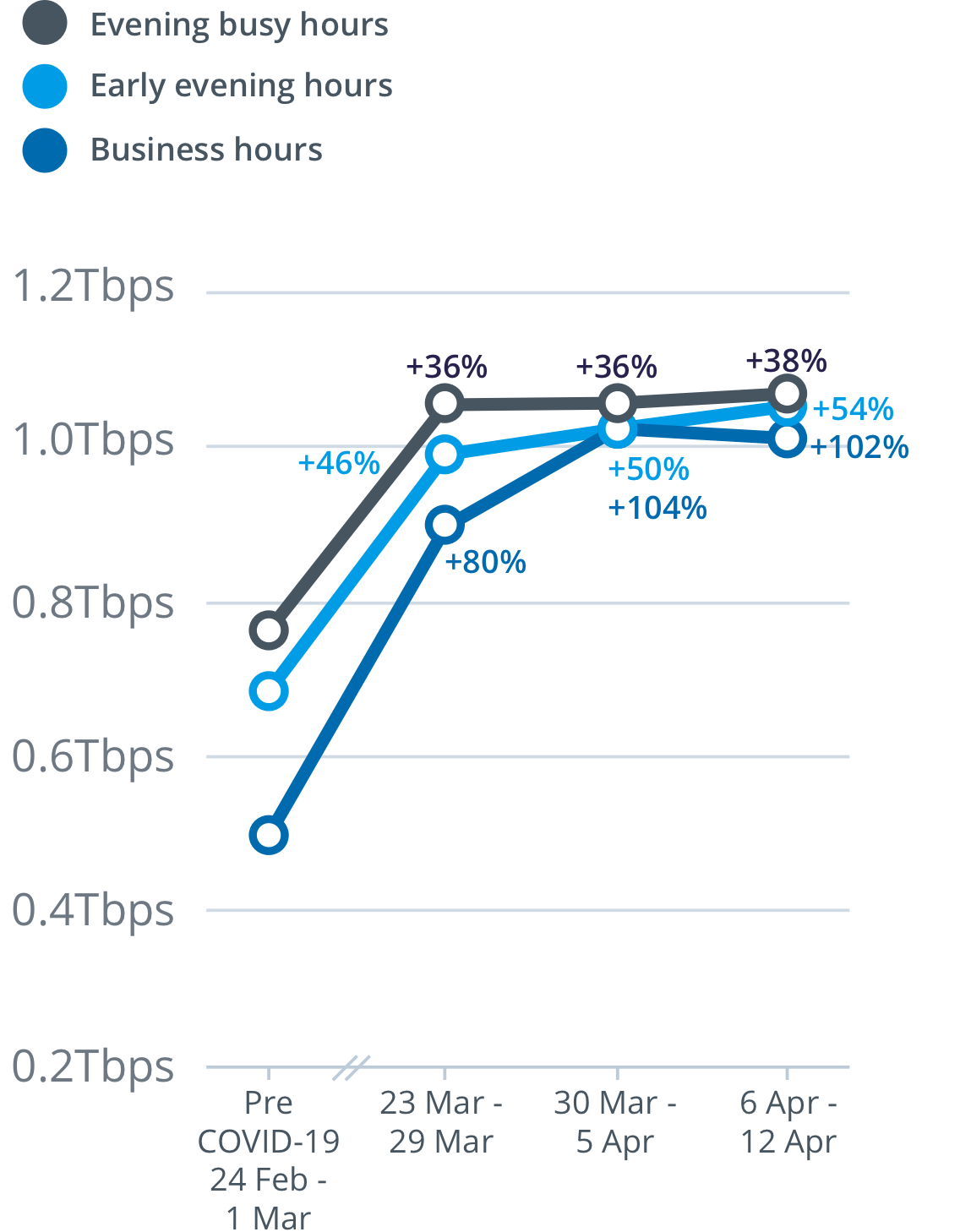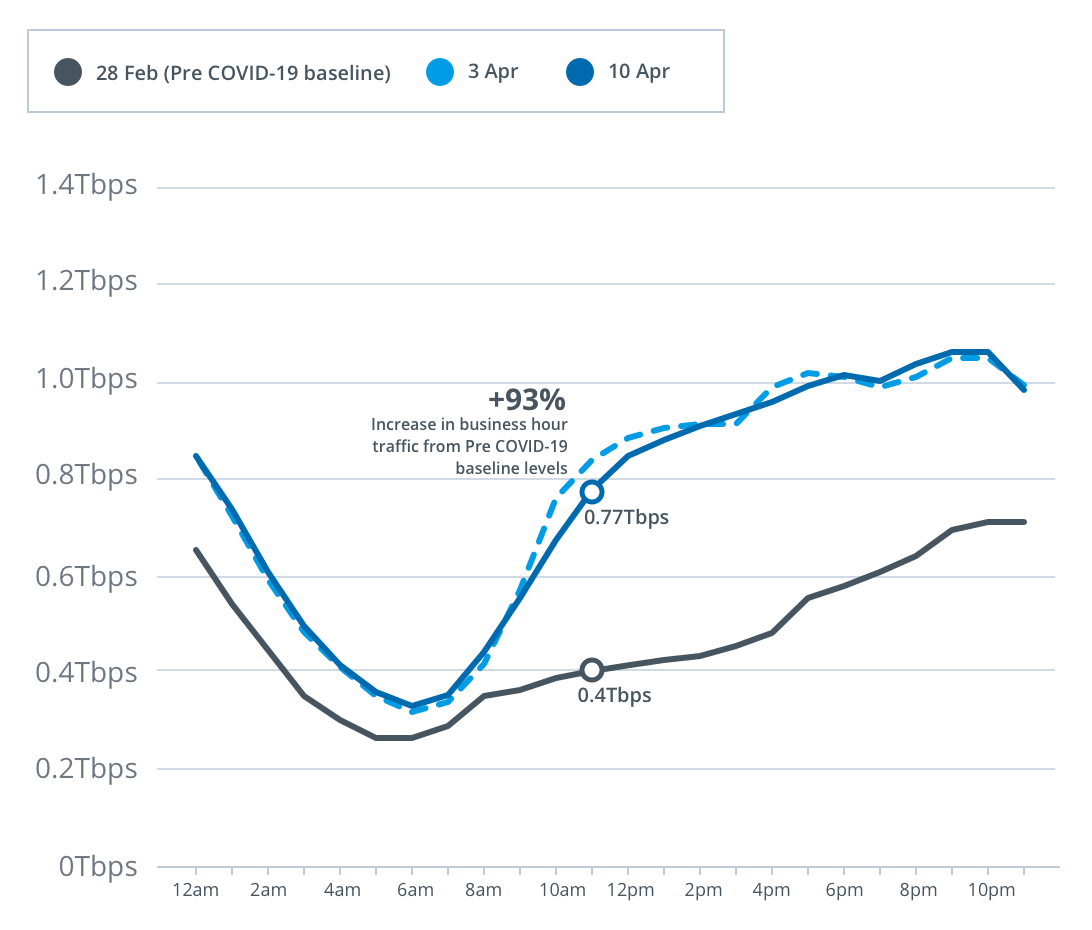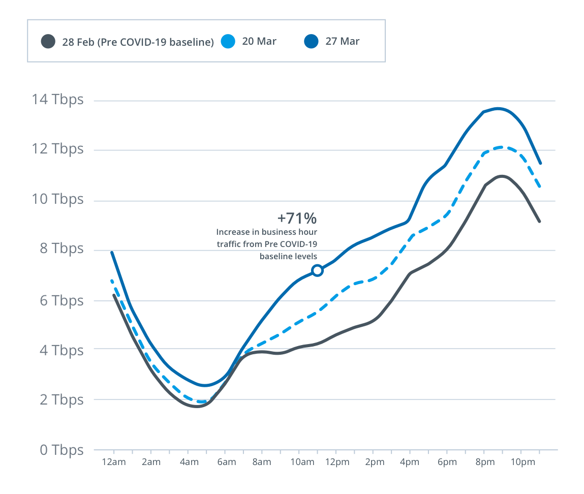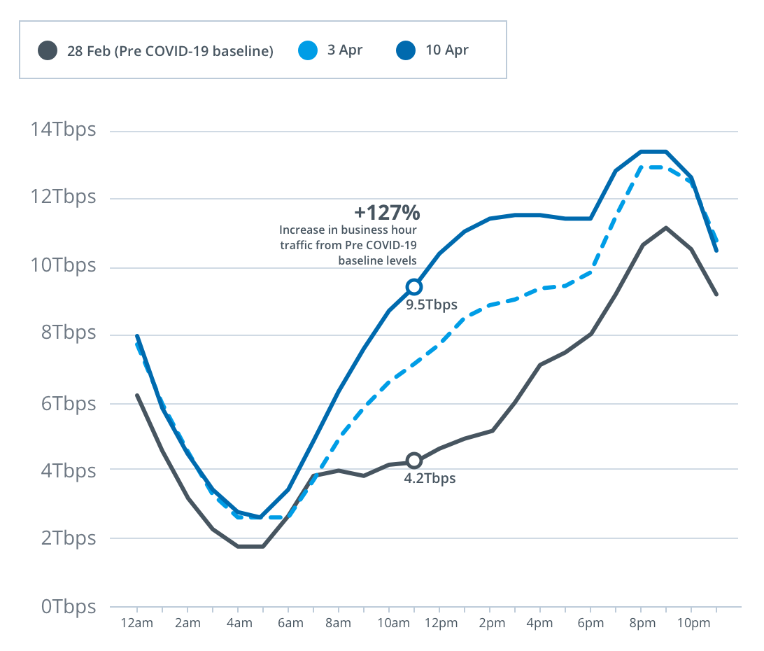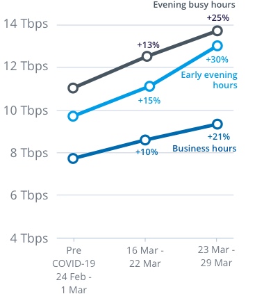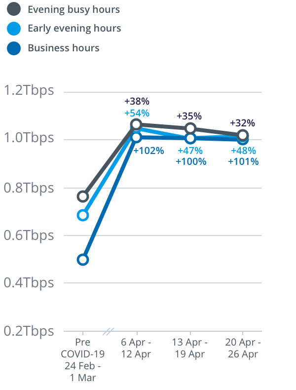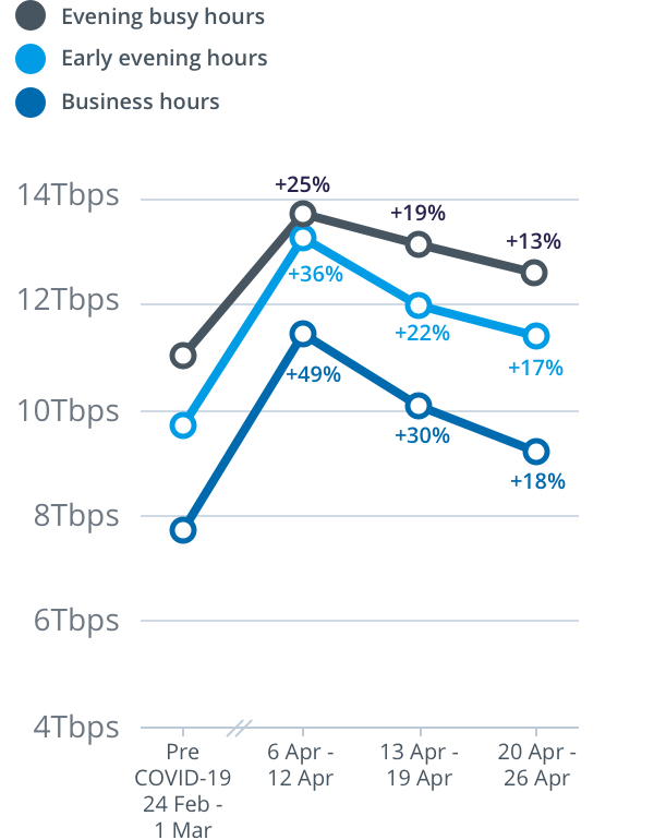 With more people working, studying and generally spending more time at home streaming content, we are seeing a change in the profile of data traffic on our network, with increasing residential usage of the network throughout the day and in the busy hours (7-11pm).