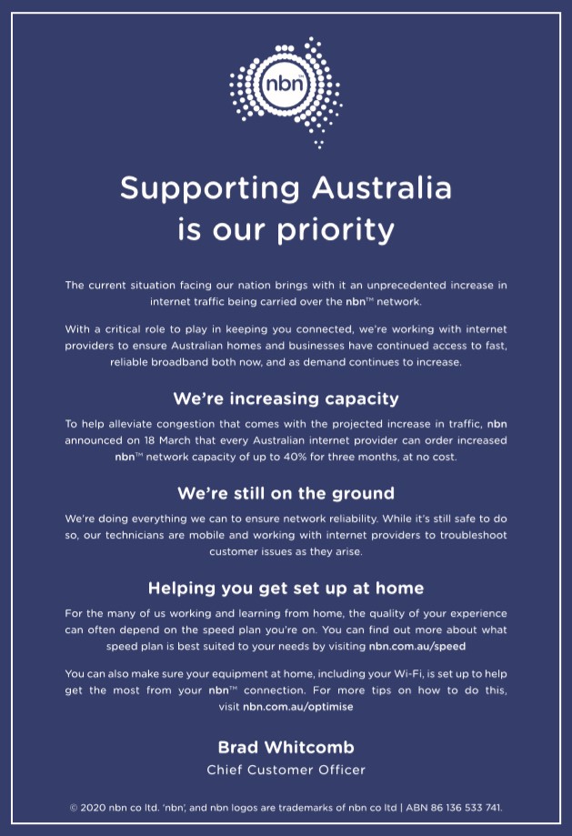 NBN Co exists to help Australian households and businesses make the most of the benefits of high-speed broadband. Our commitment, as the team behind the nbn™ access network, is to ensure we can support Australia through this time of crisis – so that when it is over, we all emerge in a position of strength and resilience.
