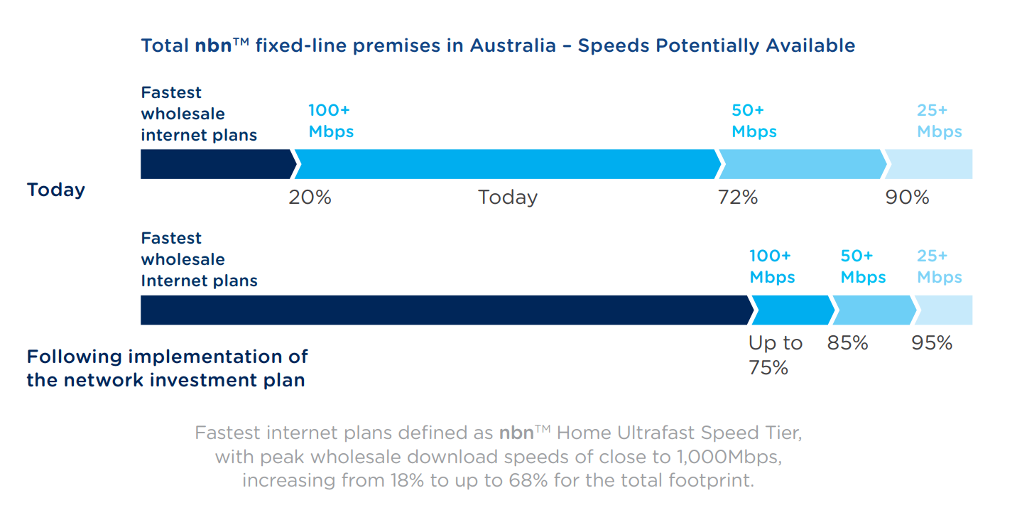 - Speed uplift for Fibre-to-the-Curb (FTTC) customers: We will aim to enable premises connected to nbn via FTTC technology to access the nbn™ Home Superfast and nbn™ Home Ultrafast speed plans through on-demand enablement and deployment of G.fast capability or the provision of fibre lead-ins in certain circumstances. G.fast technology essentially gives us the ability to deliver greater speeds to customers connected to our network via FTTC.