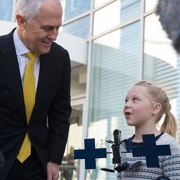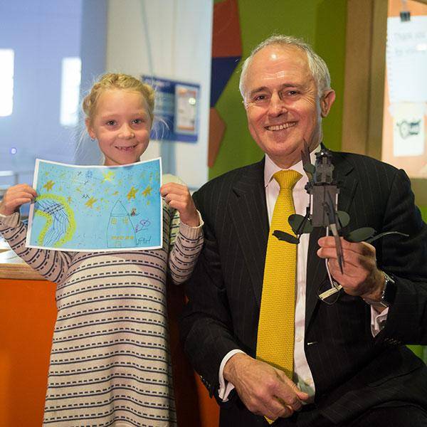 Six-year-old Bailey Brooks with Minister of Communications, Malcolm Turnbull.