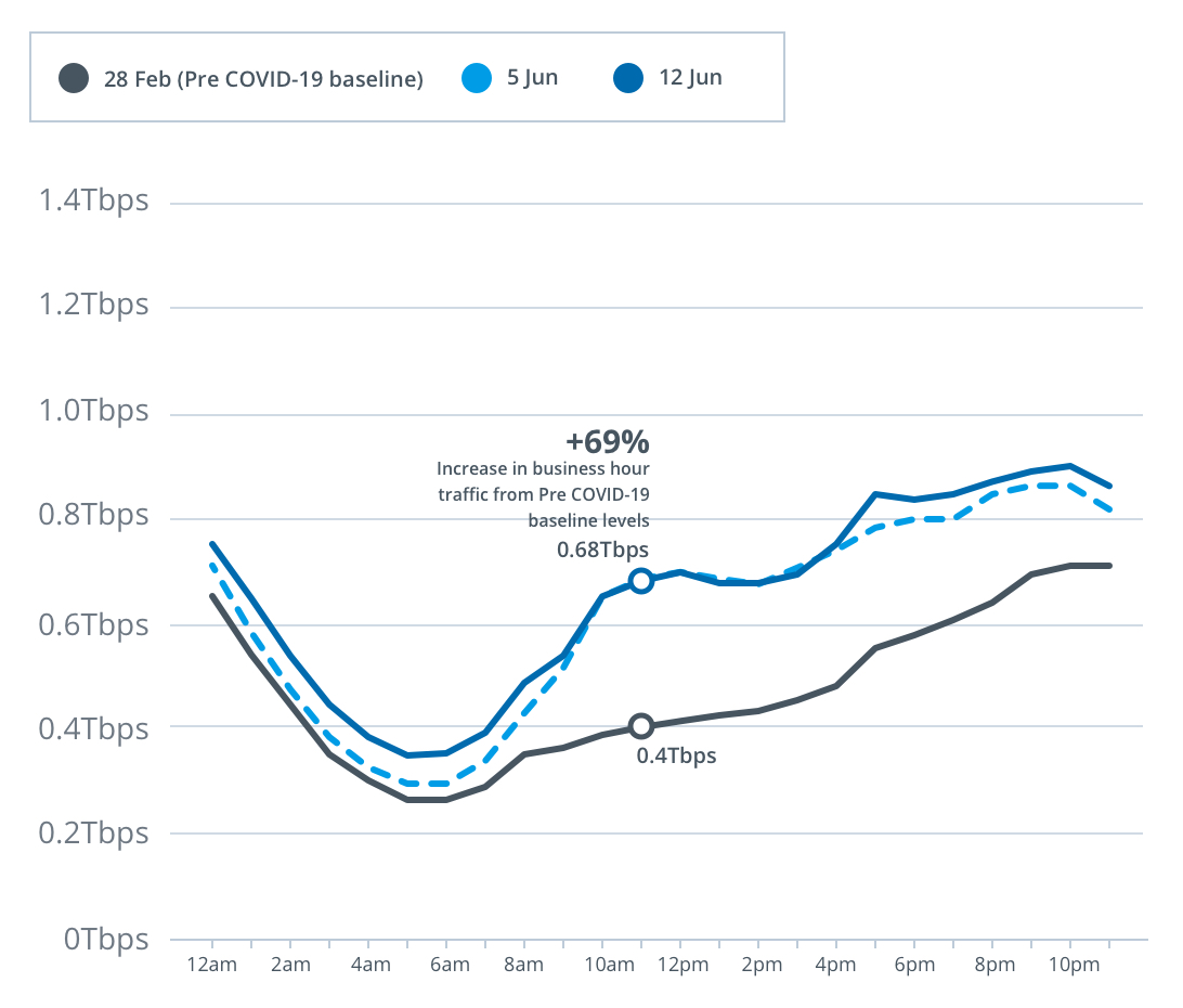 Peak download throughput during the week beginning Monday, 8 June also increased compared to the pre-COVID-19 baseline during daytime business hours, up 15 per cent to 8.9Tbps, and during early evening hours, up 23 per cent to 12.1Tbps, on the main nbn™ wholesale service.