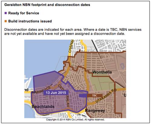 For Geraldton residents living or working in the area bordered by Marine Terrace, the John Wilcock Link and the North West Coast Highway (see below map) the 18 month countdown to disconnection started on 13 December 2013. Other areas in the region will have different disconnection dates, depending on when the NBN becomes available in the area.