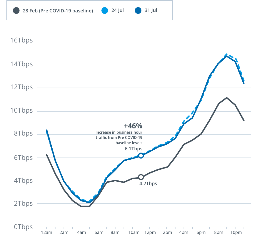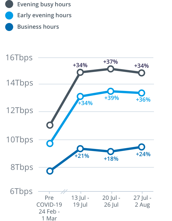 Peak download throughput during the same week also increased during daytime business hours, up 24 per cent to 9.6Tbps, and early evening hours up 36 per cent to 13.4Tbps, compared to the pre-COVID-19 baseline.