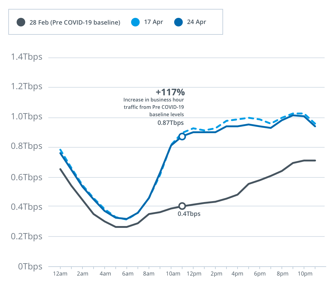 For the week from Monday 20 April to Sunday 26 April, peak download throughput (the measure of data flowing through the nbn™ access network) during daytime business hours, increased by 18 per cent to 9.2Tbps compared to the last week of February.