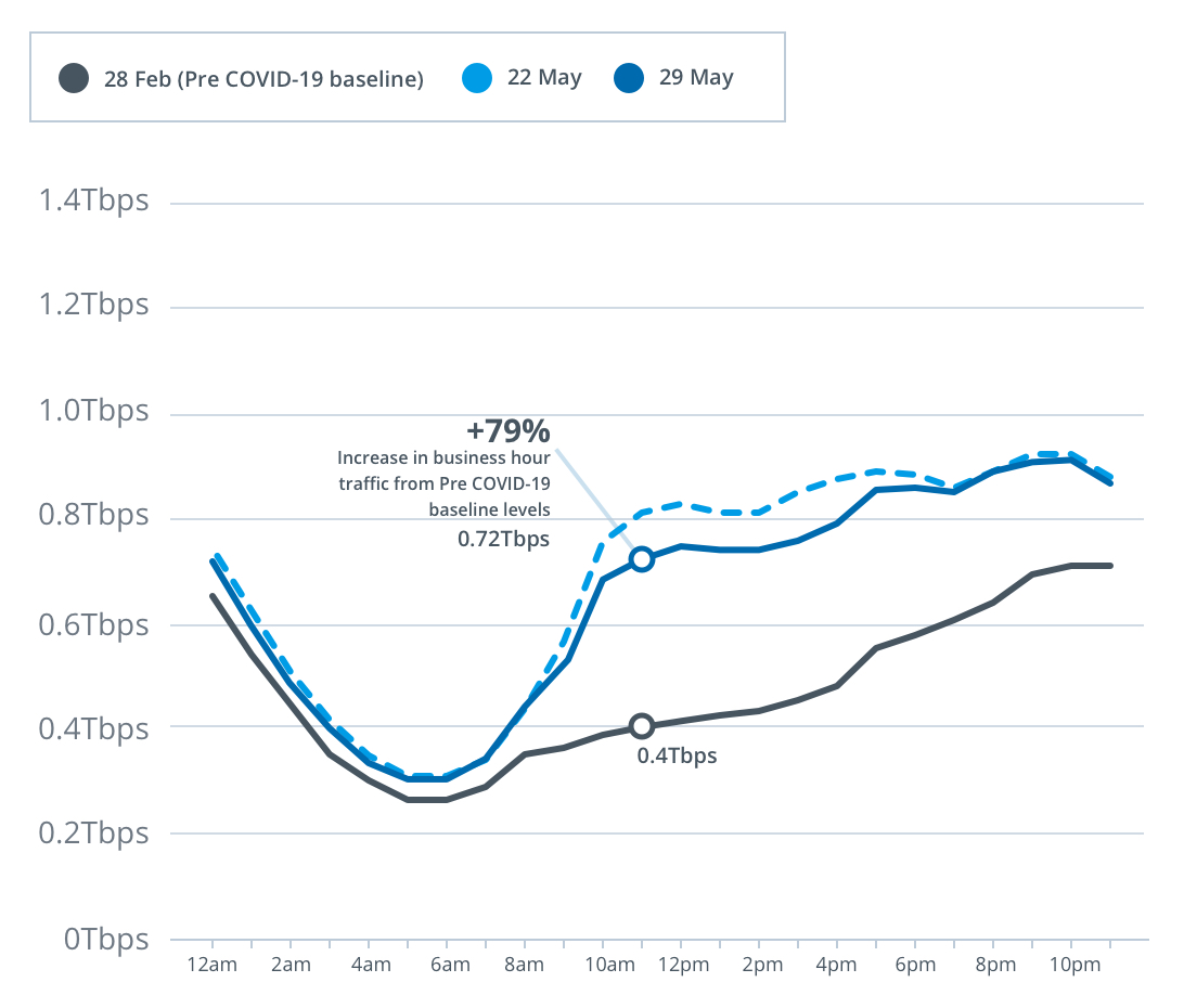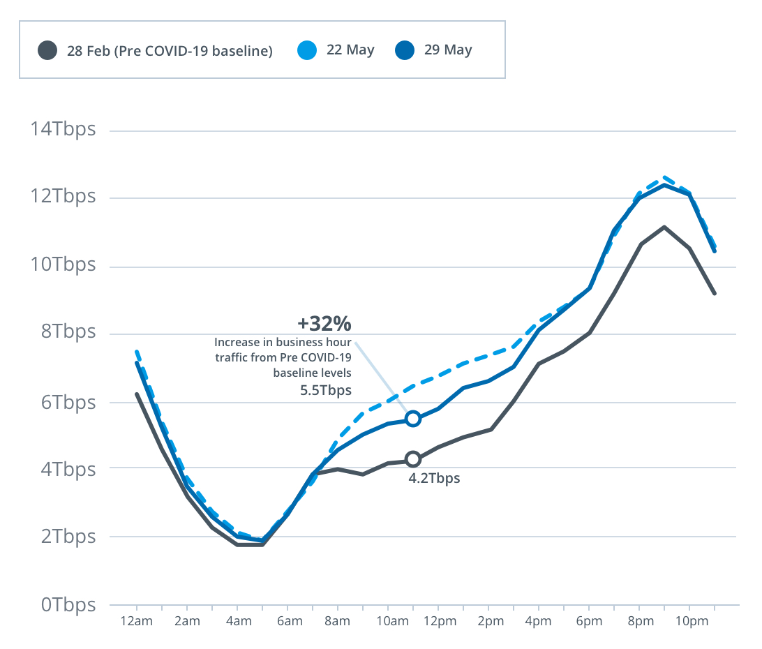 Peak download throughput during the week beginning Monday, 25 May also increased compared to the pre-COVID-19 baseline during daytime business hours, up 12 per cent to 11.0Tbps, and during early evening hours, up 7 per cent to 8.3Tbps, on the main nbn wholesale service. Despite remaining higher than pre-COVID-19 levels, these peak figures also both represent week-on-week decreases in peak data demand.