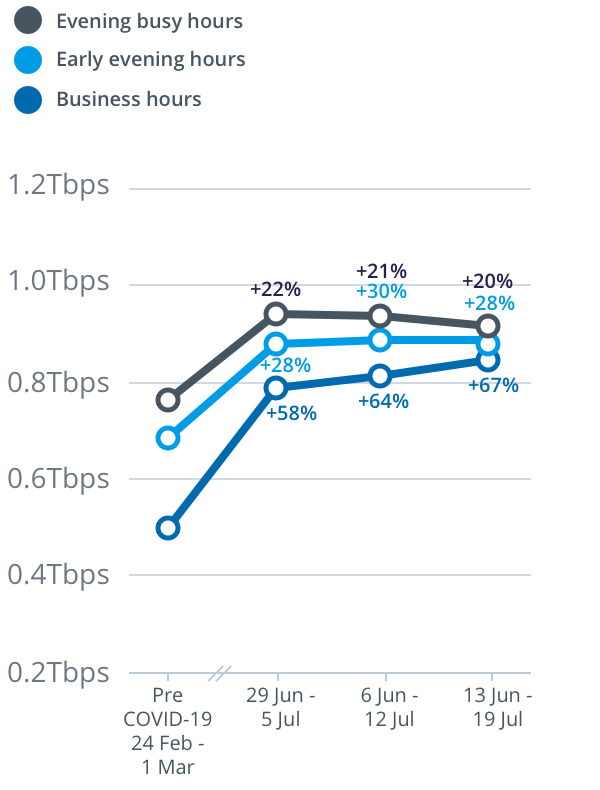 Peak download throughput during the same week also increased during daytime business hours, up 21 per cent to 9.4Tbps, and early evening hours up 34 per cent to 13.1Tbps, compared to the pre-COVID-19 baseline.