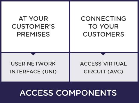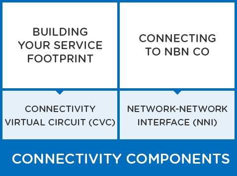 The product provides an Ethernet virtual circuit to deliver Layer 2 packets between the nbn® network boundaries, the Network-to-Network Interface (NNI), to the User Network Interface (UNI) at your customers’ premises. The nbn Ethernet product is composed of four configurable components. The components act as building blocks for you to tailor the nbn Ethernet product into your retail offers. The diagram below illustrates our product structure: